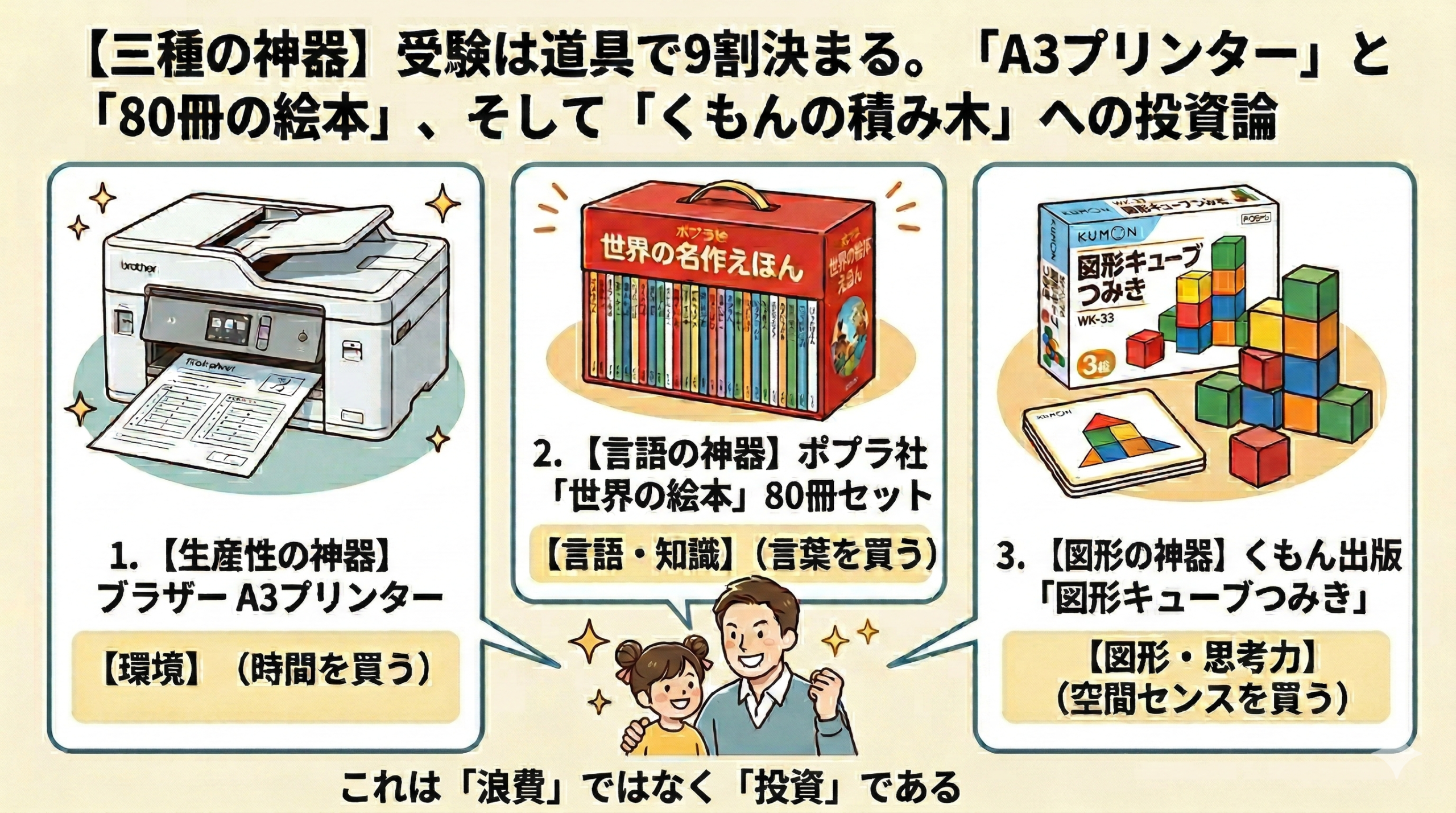 共働き家庭が過酷なお受験を勝ち抜くための鉄則。それは、**「お金で解決できる悩みは、便利なツールを買って即解決する」ことです。 今回は、我が家の合格を根底から支え、結果的に最高のコスパをもたらしてくれた、絶対にケチってはいけない「3つの物理的神器」**をご紹介します。